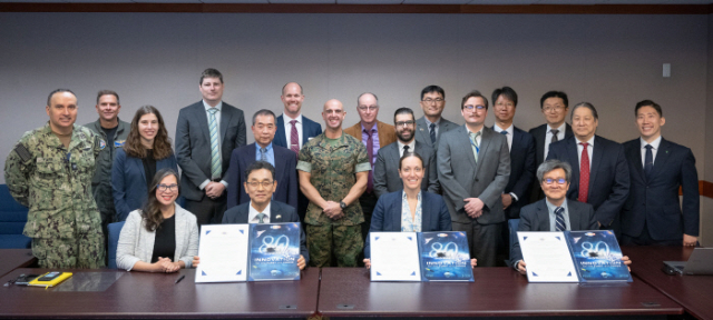 연구 협력 착수식 현장. 앞줄 왼쪽에서 두 번째부터 장광필 HD한국조선해양 미래기술연구원장, 레이첼 라일리(Rachel Riley) 미 해군연구청장(Chief of Naval Research), 김용환 서울대 조선해양공학과 교수