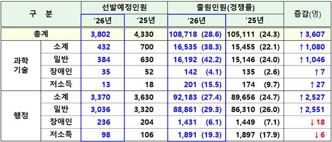 모집직군별로는 9급 과학기술직군이 38.3대 1, 9급 행정직군이 27.4대 1로 집계됐다. 과학기술직군은 432명 선발에 1만6,535명이 지원했고, 행정직군은 3,370명 선발에 9만2,183명이 몰렸다. 일반모집 기준 경쟁률은 과학기술직군 42.2대 1, 행정직군 29.3대 1을 기록했다.