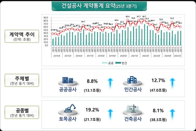 국토부에 따르면 3분기 건설공사 계약액은 전년 동기 53조7천억원에서 6조4천억원가량 늘며 두 자릿수 증가율을 기록했다. 공공부문 계약액은 13조1천억원으로 8.8% 증가했고, 민간부문은 47조원으로 12.7% 늘어 전체 증가세를 이끌었다.