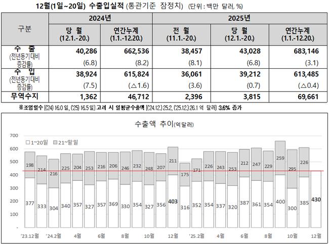 연간 누계로 보면 1월 1일부터 12월 20일까지 수출은 6,831억달러로 전년 대비 3.1% 증가했고, 수입은 6,135억달러로 0.4% 감소했다. 같은 기간 무역수지는 696억달러 흑자를 기록했다.