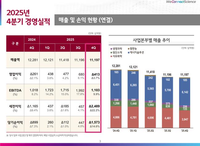 한편 LG화학은 2025년 4분기 연결 기준으로 매출 11조1971억원, 영업손실 4133억원을 기록했다. 회사는 업황 변동성 속에서도 재무 안정성과 중장기 성장 기반을 병행해 강화해 나간다는 방침이다.