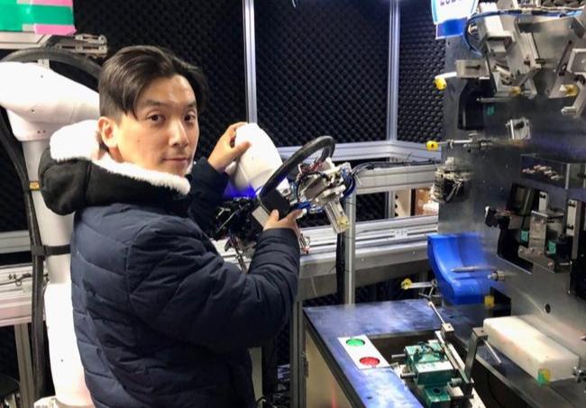 한국폴리텍대학 부산캠퍼스 소프트웨어융합과 졸업 후 스마트 제조 솔루션 기업에 취업해 컴퓨터비전 기반 AI시스템 구축을 담당하고 있는 정용건씨. 사진은 정씨가 협동로봇을 조작하고 있는 모습