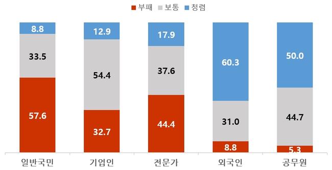 사회 분야별로는 일반국민·전문가·공무원이 ‘정당·입법’을 가장 부패한 분야로 꼽았고, 기업인은 ‘언론’, 외국인은 ‘종교단체’를 가장 부패하다고 평가했다. 반대로 가장 청렴한 분야로는 일반국민·기업인·전문가가 ‘교육’을, 외국인은 ‘문화·예술·체육’을, 공무원은 ‘행정기관’을 각각 선택했다.