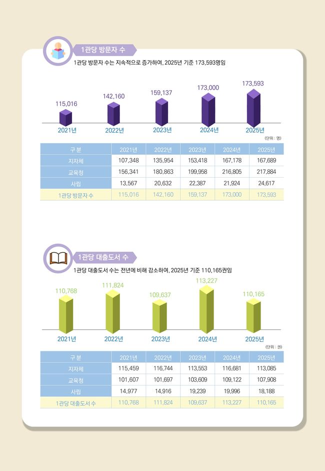 전문 인력 확충도 이어졌다. 정규직 사서 수는 6276명으로 전년보다 3.4% 증가했으며, 사서 1인당 담당 인구는 8145명으로 줄어 서비스 밀도가 개선됐다. 이는 보다 전문적이고 세밀한 이용자 맞춤형 서비스 제공 기반이 강화됐음을 의미한다.